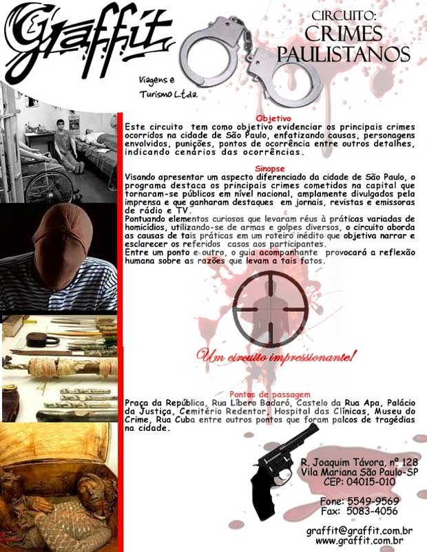 O Circuito de Crimes Paulistanos, criado pela agência Graffit Projetos Turísticos, vai concentrar-se nos crimes ocorridos no centro da cidade desde o século XIX até ao presente, "enfatizando causas, personagens envolvidos, punições (...), entre outros detalhes".