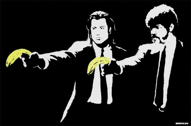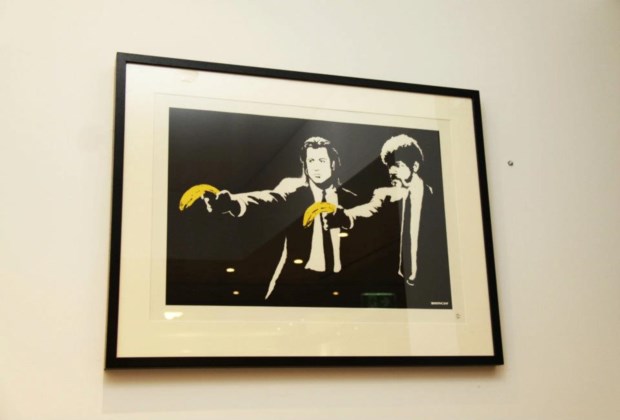 O quadro em questão, desta feita, também de Banksy - e já alvo de várias tentativas frustradas de roubo -, parece que foi feito para este jogo do gato e do rato: é um Pulp Fiction, que recria uma imagem icónica do filme homónimo de Quentin Tarantino em redor de uns palradores bandidos (representados por Travolta e Samuel L. Jackson). No Facebook da marca, seguem-se as tentativas de roubo e informações relacionadas.