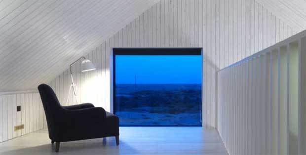 Perto de Thorpeness, Suffolk, num "local idílico mesmo na orla do mar", aninhado nas dunas. Pode ir-se directamente do quarto para a praia, as vistas panorâmicas prometem ser admiráveis de todos os pontos e aberturas desta casa desenhada pelos arquitectos noruegueses JVA (Jarmund/Vigsnæs). Para 9 pessoas - 4 noites custam 764,5€.