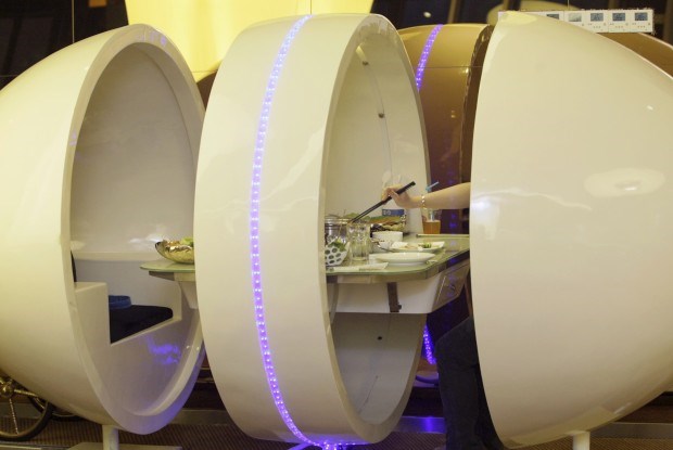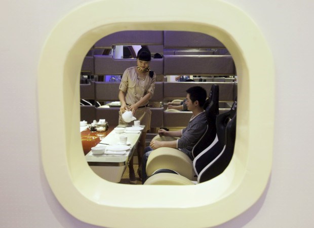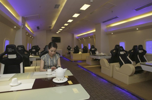 Senão, veja-se: ocupa 600 metros quadrados e inclui seis salas privadas; as empregadas de mesa vestem-se (e comportam-se) como assistentes de bordo; e as cadeiras, mesas e demais objectos de decoração foram copiados para que se pense estar a mais de dez mil metros de altitude.