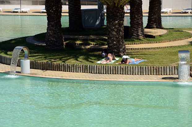 A zona mais calma da piscina inclui uma ilha no centro, com palmeiras, que "transporta" os visitantes para outras latitudes. Mas a zona com maior impacte é mesmo uma piscina de ondas que, com 2100 metros quadrados, é a maior do género em Portugal.