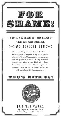 O anúncio foi publicado a página inteira no jornal USA Today, na sexta-feira, e tem diversas versões já divulgadas, nomeadamente online, onde se tornou viral. Neste, aponta-se o dedo aos que "traíram a promessa aos seus 'irmãos' de Las Vegas" e convoca-se os "defensores de que o que acontece em Vegas deve ficar no seu lugar legítimo - em Vegas". O anúncio prossegue com um apelo a que os "exploradores do príncipe Harry" sejam socialmente "escorraçados". "Boicotaremos festas de qualquer tipo com eles. Nenhuma bebida. Nenhuma rapariga de biquíni.", sublinha-se... E para quem ainda não percebeu o alcance da ameaça: "Por outras palavras, nunca mais brincaremos com eles". No inglês play confunde-se com jogo e, por isso, o aviso é para ser levado a sério, como se fosse um chefe de casino a avisar que está atento aos prevaricadores.