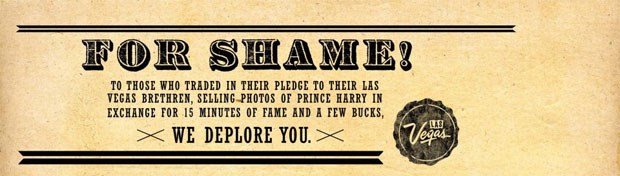 "For shame!", intitula-se o anúncio divulgado pela Las Vegas Convention & Visitors Authority, o organismo que gere o turismo da "cidade do pecado". A "vergonha", qual condenação eterna, recai sobre o autor das fotos de Harry, nu após um jogo de strip-bilhar (as regras são irrelevantes, aqui o que interessa é que quem perde, despe). Num modelo arcaico e com vocabulário propício - a lembrar anúncios de outras eras e pestes -, aponta-se um furibundo dedo a quem teve a ousadia de quebrar o código partilhado por todos os que põem um pé em Vegas. "Whatever happens in Vegas, stays in Vegas" é um lema mítico, tão mítico que é também slogan turístico oficial e registado.