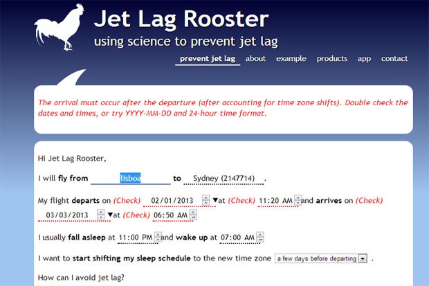 O Jet Lag Rooster (Galo do Jet Lag) cria um plano específico, tendo em conta os locais e horas de partida e chegada e o padrão de sonos de cada um. O objecivo é a adaptação total à nova zona horária. As dicas podem incluir os dias anteriores à viagem de forma a chegar ao destino já em estado de alerta ou iniciar-se apenas no dia da expedição. Pelo meio, sugerem-se também produtos (como caixas de luz portáteis, que recriam um ambiente luminoso) ou óculos especiais para proteger a visão de luz indesejada.