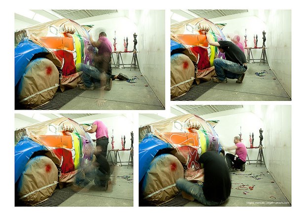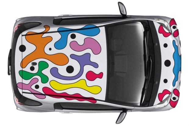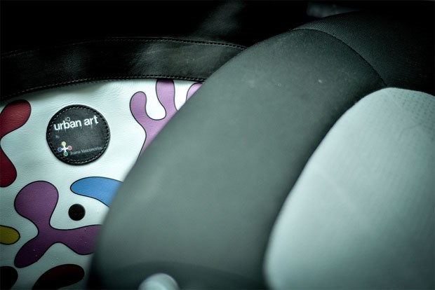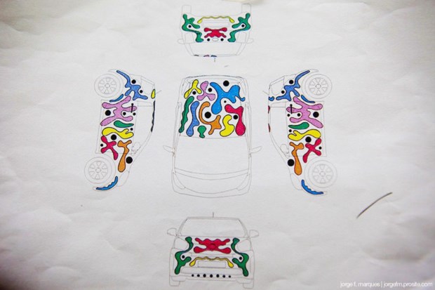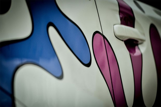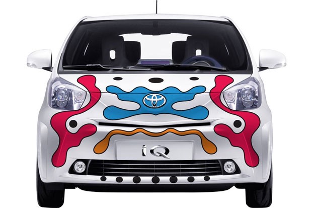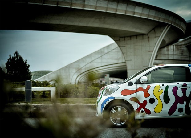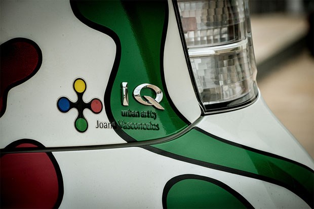 É um Toyota iQ, mas não é igual aos outros. Sobre o fundo em branco-pérola, há formas e várias cores. As formas também não são como as outras: são produto da criatividade de Joana Vasconcelos.
