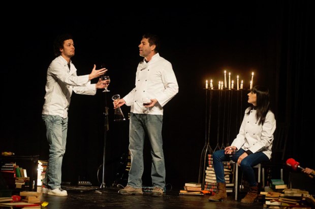 “Estes três cozinheiros não têm panelas, têm livros e cozinham com livros”, explica o actor e encenador. “Durante uma hora propomos fazer uma ementa que vive da poesia e da prosa como se estivéssemos a fazer uma ementa. No fundo, estamos a cozinhar, só que a nossa cozinha são palavras”.
