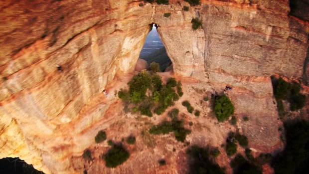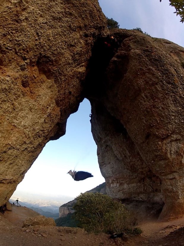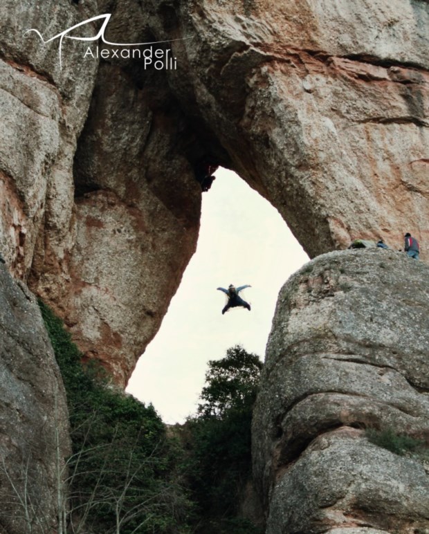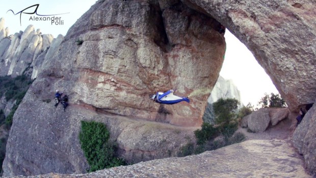 O voo, segundo informação na ficha do vídeo publicado esta terça-feira, foi realizado em Dezembro, na Foradada de Montserrat, na Catalunha. Alexander Polli, norueguês de 28 anos, especializado em desportos radicais aéreos (basicamente todos os que envolvam saltos arriscados e quedas-livres), já tinha realizado (e filmado) diversas proezas, cada uma mais vertiginosa que a outra. Mas, desta feita, há que levar em conta que o norueguês realiza um "voo táctico através de uma cova estreita" numa montanha particularmente escarpada.