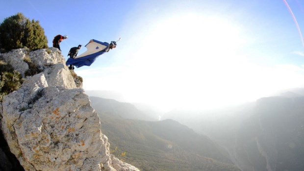 O radical desportista lança-se em queda livre de um helicóptero e avança depois, em voo no seu fato-com-asas, em direcção ao buraco entre as rochas com uma precisão impresionante.
