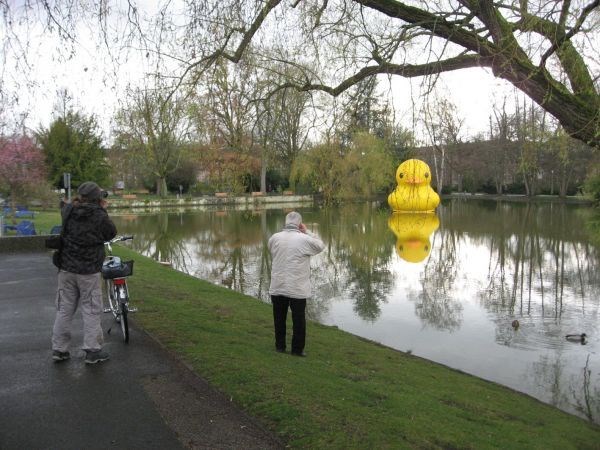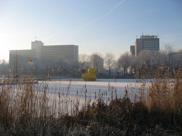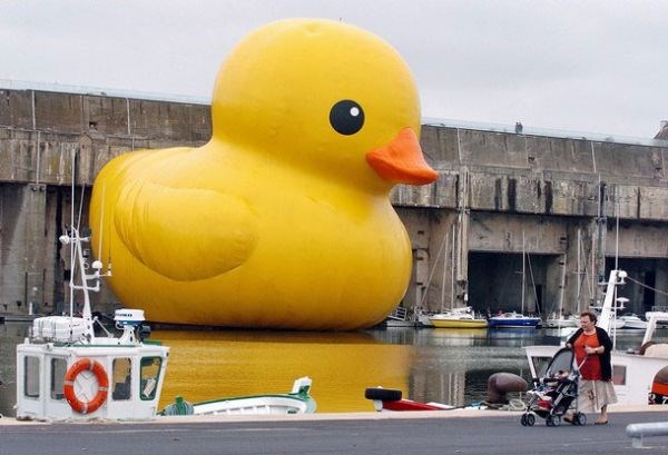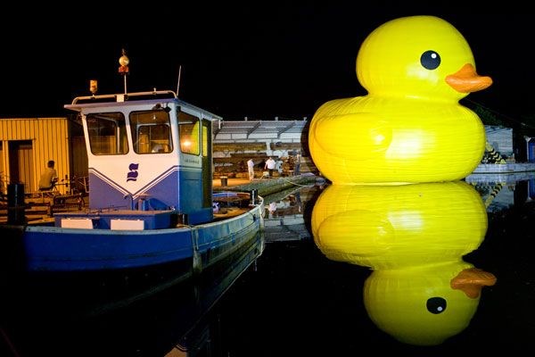 "O 'Rubber Duck' não conhece fronteiras, não discrimina ninguém e não tem conotações políticas", sublinha Hofman (entretanto confirmado como participante no 180 Creative Camp, que se realiza em Julho em Abrantes) na apresentação do projecto, que, na prática, não podia ser mais básico. Materiais: pato de borracha insuflável gigante, gerador, barcaça. Mas este "amigável e flutuante" pato de borracha, garante o artista, tem até "propriedades terapêuticas" e pode mesmo "aliviar tensões mundiais". Entre os motivos para tal façanha, está a sua capacidade para obrigar os espectadores a rever perspectivas a partir desta desemesurada criação que remete à infância.