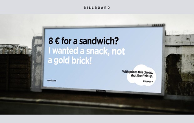 Só uma bagagem de mão? Os bancos não são reclináveis? Oito euros por uma sande? Quero comer, não quero um lingote de ouro! "As pessoas voam com a Ryanair não pelo conforto, mas porque é barato", lê-se na campanha "With prices this cheap, shut the f*ck up".