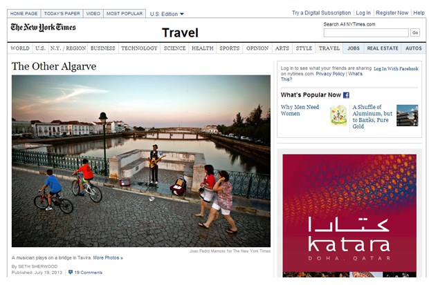A imagem de um músico a tocar guitarra na ponte de Tavira ao pôr-do-sol dá o tom de abertura a um grande destaque do jornal norte-americano "The New York Times" (NYT) ao turismo na região algarvia.