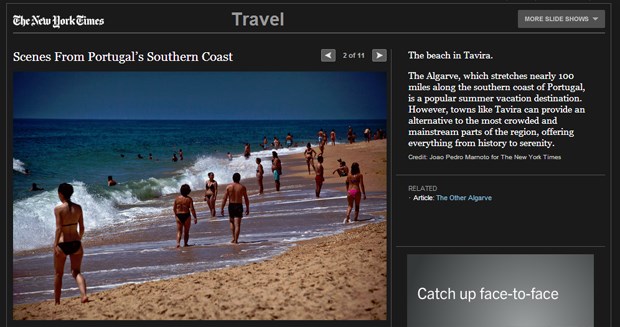 A reportagem, ilustrada com fotografias de João Pedro Marnoto (premiado fotógrafo português, responsável por projectos como Fé nos Burros) acabará por destacar a mais calma Tavira, num passeio repleto de detalhes sobre a cidade e arredores - entre o centro histórico, lojas ou restaurantes - e que, "felizmente", coincidiu com o festival local dedicado à gastronomia do mar, tendo aindo dado direito a navegar até à Ilha de Tavira.