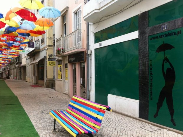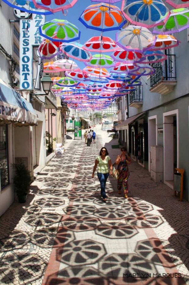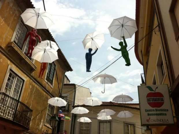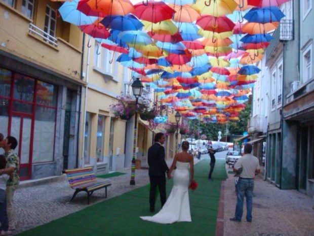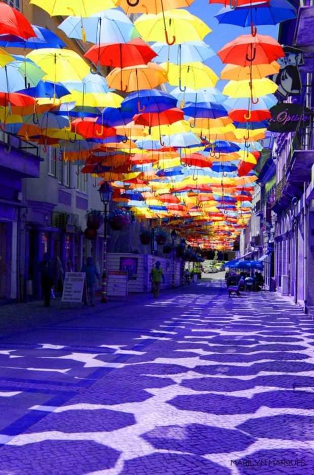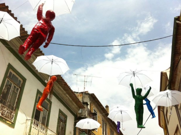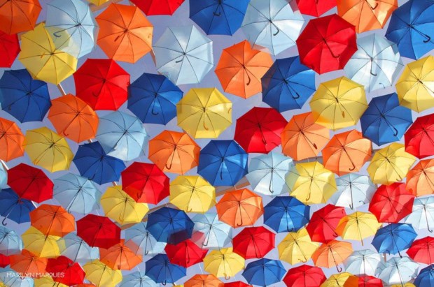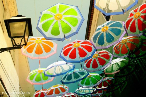 Estão a chover chapéus-de-chuva em Águeda. Explodem em cores, em padrões floridos, desenham sombras geométricas pelas paredes e calçadas. É uma instalação artística que, aliás, junta o útil ao agradável: é de encher o olho e protege do sol (ou, claro, de algum pingo de chuva estival), além de ser um ímane (até virtual) para visitantes.