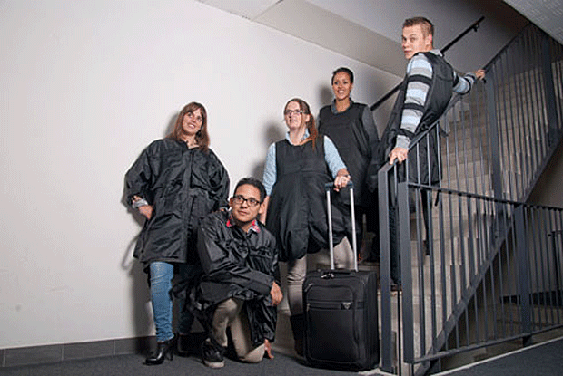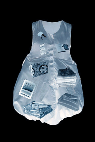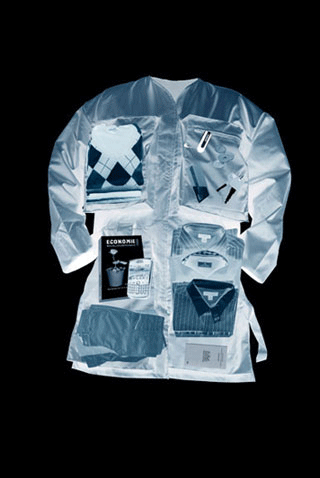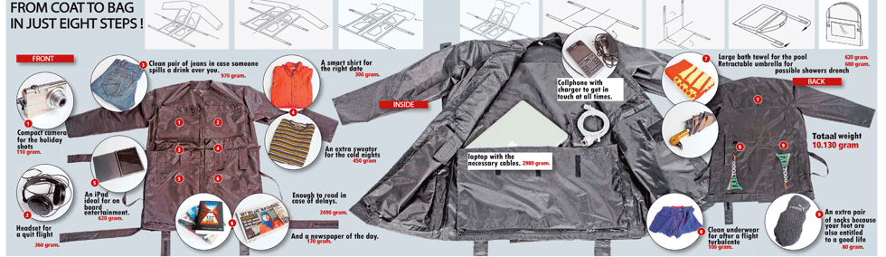 Os casacos, fabricados num material à prova de água, tem 14 bolsos dos mais variados tamanhos, permitindo colocar desde um computador portátil até à roupa interior. Convenientemente, o casaco transforma-se numa mala em três tempos.