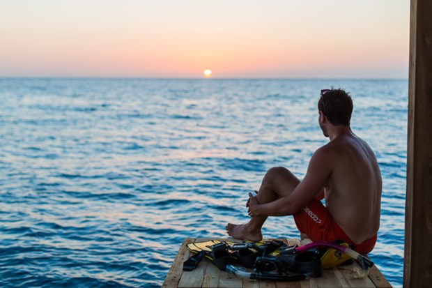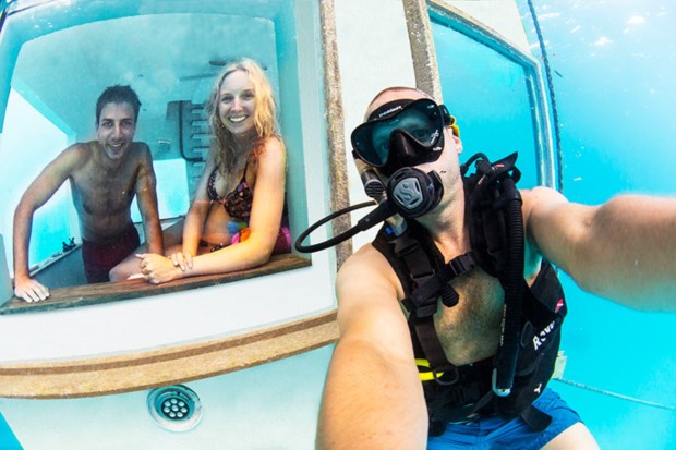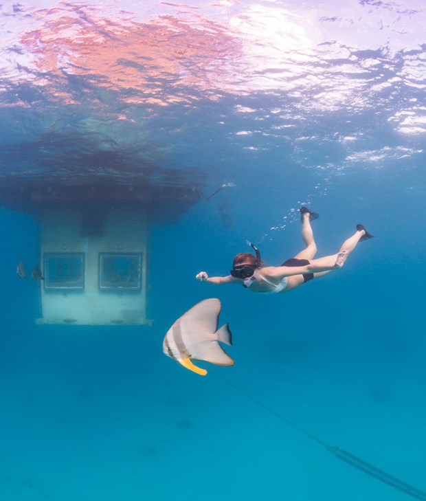 Pelas janelas do especialíssimo alojamento, todo um mar a efervescer de animação, com cardumes de peixes prateados e coloridos, predadores em busca de alimento, lulas e polvos, toda a vida do recife de coral que rodeia a estrutura.