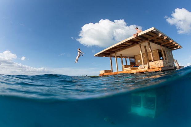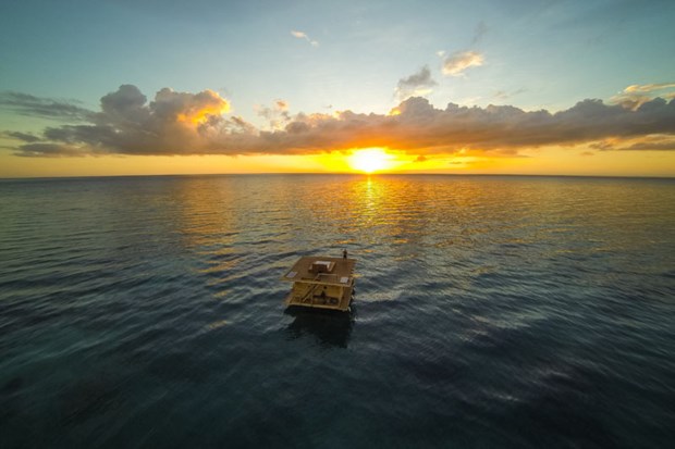 O quarto-aquário é parte de uma casa que, na verdade, é em si uma espécie de ilha privada: está a flutuar no meio do oceano, um “deck” ancorado no Índico que inclui piso superior e terraço com romântica cama para apanhar sol ou dormir sob as estrelas.