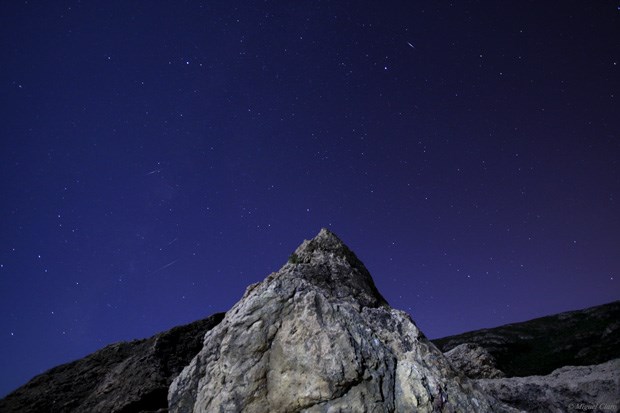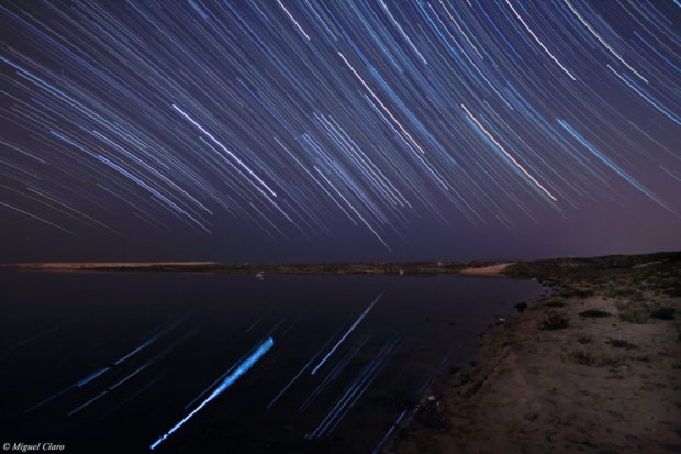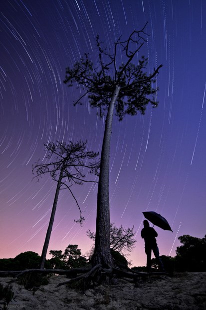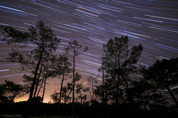 Rastos de estrelas como chuva caindo sobre um pequeno pinhal na Fonte da Telha, na noite das Perseidas em 13/08/2011 (00h14 a 01h23). 75 imagens alternadas cada uma de 25 segundos, totalizando integração de 31 minutos. São visíveis diversas constelações como Cepheus, Cassiopeia, Perseus, Andromeda, Pegasus e o planeta Júpiter.