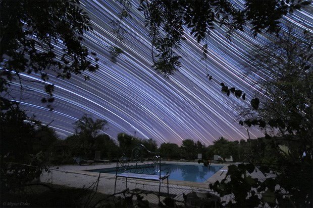 Rotação das estrelas que circundam a região da estrela polar. No Alentejo, em 19/07/2010 (23h32 a 02h31). Soma de 328 imagens cada uma de 30 segundos, totalizando uma integração de 2h44 minutos. São visíveis várias estrelas das constelações da Ursa Menor, Ursa Maior, Draco e Cepheus.