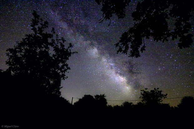 Via Láctea vista no Alentejo, em Vila Boim, Elvas. A imagem foi obtida na região sul do céu. Ao centro, a Via láctea e simultaneamente o rasto das estrelas que a compõem, descrevendo o movimento da esfera celeste ao longo da noite. Vêem-se diversas constelações como: Lyra, Aquila, Scutum, Sagittarius, Scorpius, Aquarius, Capricornus.