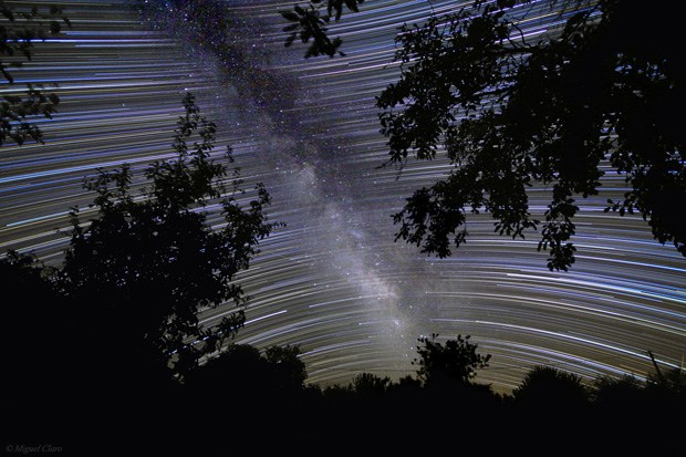 Imagem do rasto das estrelas na região sul do céu, na zona da Via Láctea. Imagem obtida num pinhal da Fonte da Telha, na noite das Perseidas. (uma das 100 melhores do ano segundo a "Astronomy")