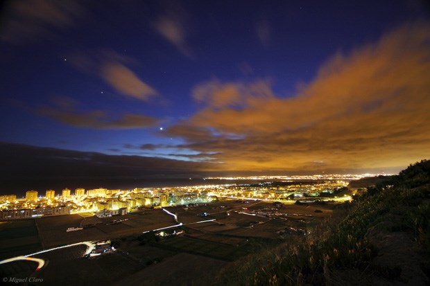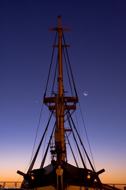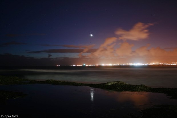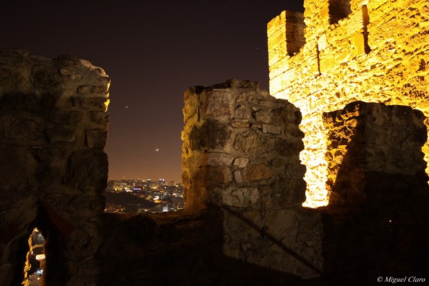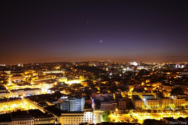Imagens obtidas nas muralhas do Castelo de São Jorge, vendo-se Lisboa. No céu, pode ser apreciado um “Earthshine” lunar numa conjunção entre Vénus e a Lua.