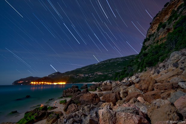 Rasto das estrelas obtido perto da Lagoa de Albufeira, numa “Star Party” em 11/09/2010 entre as 21h42 e a 23h01. Soma de 146 imagens cada uma de 30 segundos, totalizando uma integração de 73 minutos.