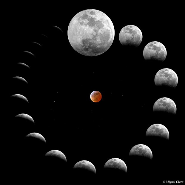 Eclipse total da Lua, visto a partir do Portinho da Arrábida. Em Portugal, a lua já nasceu eclipsada e na fase da totalidade, sendo possível ver a mudança de tom no rasto à medida que a Lua sai do cone de sombra da Terra, até ao término do Eclipse.