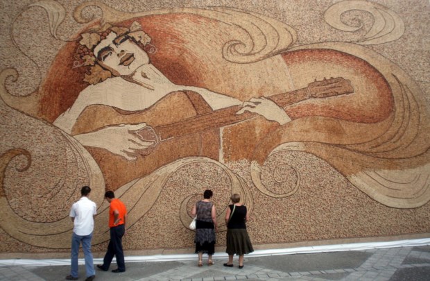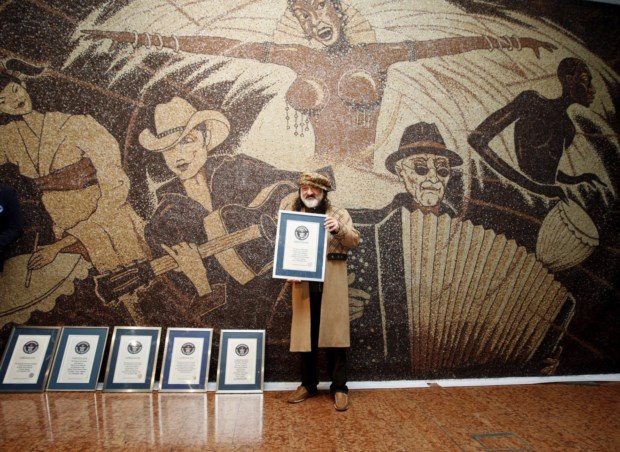 Ao longo da sua carreira, o albanês Saimir Strati (n.1966), membro da Associação Britânica de Mosaico Moderno, já foi responsável por diversas obras e restauros importantes em zonas arqueológicas. Mas, acima de tudo, é "viciado" no Guinness: já tem oito recordes, desde o anterior maior mosaico de rolhas de cortiça (com, precisamente, 229.764 rolhas no hotel Sheraton de Tirana) até peças criadas com feijão ou grãos de café, palitos ou mesmo palhinhas.