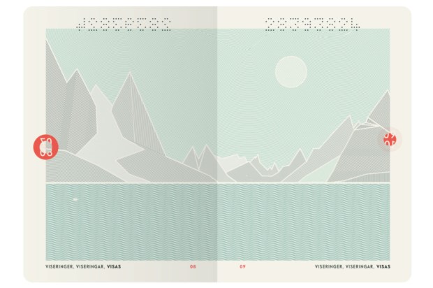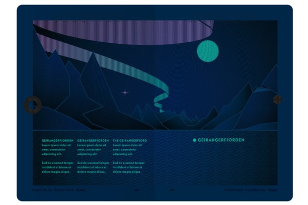 Com o conceito “A Paisagem Norueguesa”, o estúdio Neue, de Oslo, pintou as páginas interiores do novo passaporte com panorâmicas naturais do país nórdico, desenhadas com linhas finas em cores pastel, num design minimalista. Paisagens que se transfiguram sob luz UV: o escuro da noite chega às páginas do documento para fazer surgir auroras boreais de tons verdes e roxos, que serpenteiam sobre o céu tracejado, num efeito inesperado e inovador.