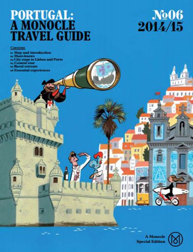 Um mapa de Portugal em tons de verde, com os monumentos principais, muitas ondas e árvores, é a primeira ilustração de José Cardoso que vemos quando folheamos “Portugal: A Monocle Travel Guide”. O pequeno guia de 36 páginas integra a edição de Dezembro/Janeiro da revista britânica, já nas bancas, e esquematiza, em textos curtos e fotografias, o que de melhor há para conhecer em Portugal.
