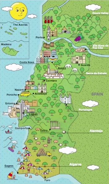 À medida que as várias regiões do país são apresentadas (em falta está informação sobre os arquipélagos da Madeira e dos Açores), o trabalho do ilustrador — que conhecemos em 2012 aquando da sua greve de fome por um trabalho — vai aparecendo em pequenos pormenores. Doçaria conventual e cortiça no Alentejo, o cão de água e as típicas açoteias no Algarve, as tripas à moda do Porto e o vinho verde do Minho são alguns dos pormenores. Na última página, um roteiro nacional em seis desenhos: dos mercados tradicionais de frescos aos ovos moles aveirenses, há ainda tempo para a saudade do fado e passeios pela natureza — a Costa Vicentina aqui em destaque.