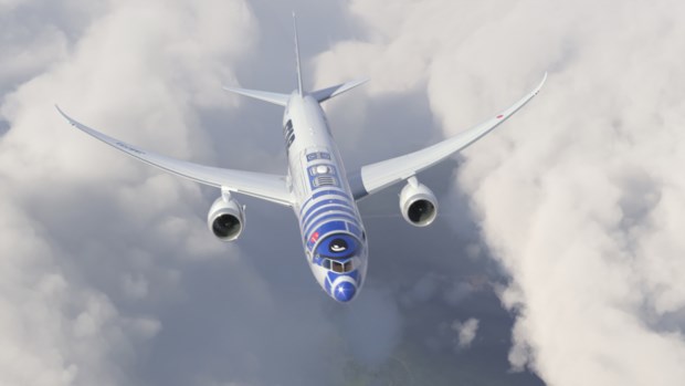 Desenvolvido para assemelhar-se ao robot R2-D2, personagem maior da série de filmes de George Lucas, o Boeing 787 Dreamliner é um projecto conjunto da Disney e da All Nippon Airways (ANA).