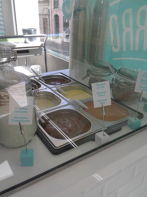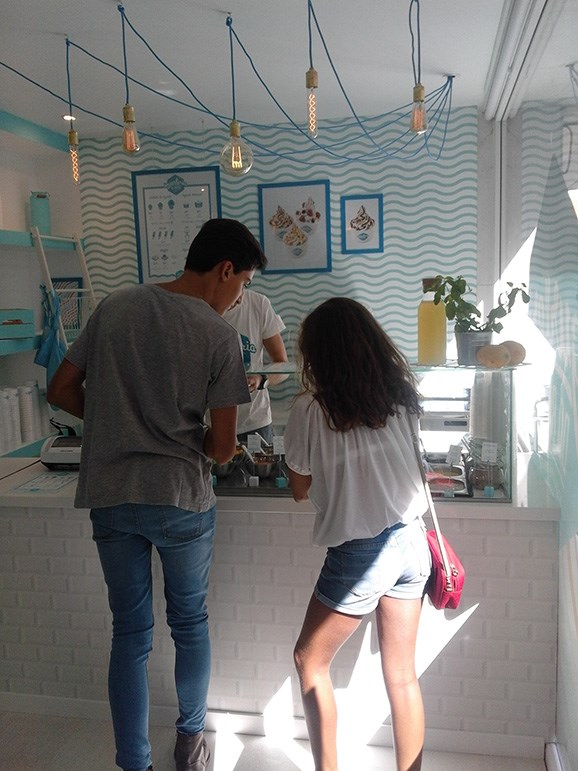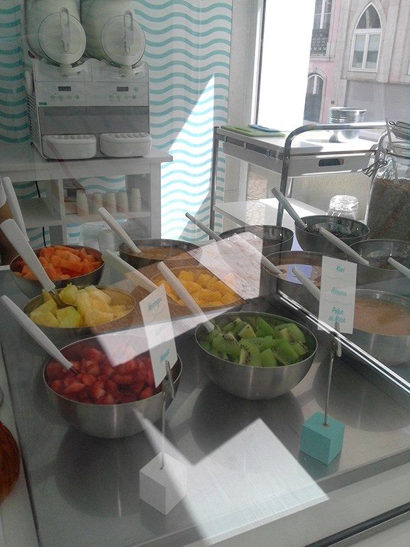 O gelado feito de iogurte natural e leite magro, “proveniente de produtores 100% nacionais”, pode ainda ser servido em copo e acompanhado com os toppings à escolha na pequena vitrine. Há frutas da época, chocolates líquidos, frutos secos e cereais. O copo mais pequeno custa 2,50€ com uma cobertura, o maior custa 3,50€ e inclui três coberturas. A carta inclui ainda picolés e waffles, entre outros.