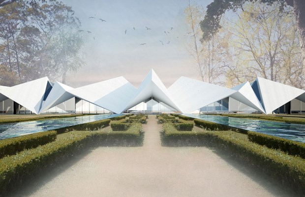 "Se o parque é uma viagem, o nosso edifício desenha-se estável na terra e lança-se com as velas ao vento", lê-se no resumo mais poético do projecto do atelier dos arquitectos Tiago Rebelo de Andrade, Diogo Ramalho e José Rico Sofia.
