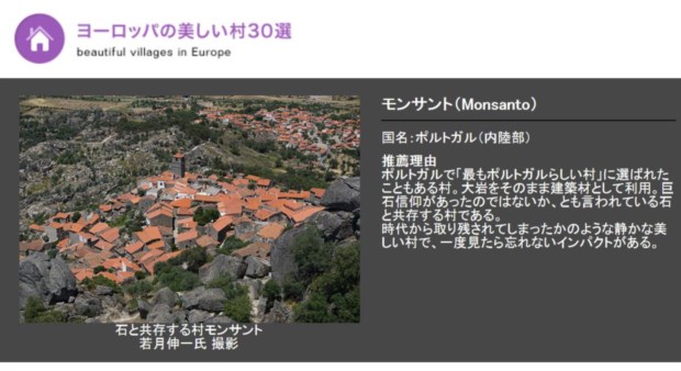 Com esta distinção, Monsanto passa a integrar uma publicação sobre as mais belas vilas e aldeias da Europa, com uma tiragem de 100.000 exemplares, o que contribui para a divulgação da pequena aldeia em larga escala junto dos mercados japoneses.