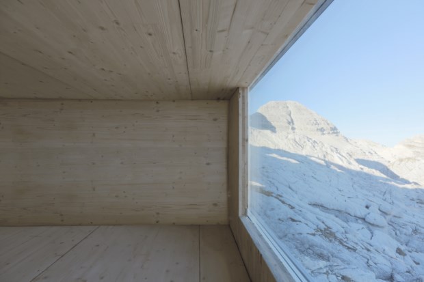 A cabana de madeira, de traços contemporâneos e fachada em vidro para a cordilheira alpina e mar Adriático, dificilmente conseguiria ser mais minimalista: cerca de 9,7 metros quadrados, com duas placas de madeira a criar três “camas” em beliche junto à janela, e dois bancos corridos junto à entrada. No total, cabem nove pessoas. O topo do monte Kanin, onde está localizada, é apenas acessível de helicóptero ou escalada.