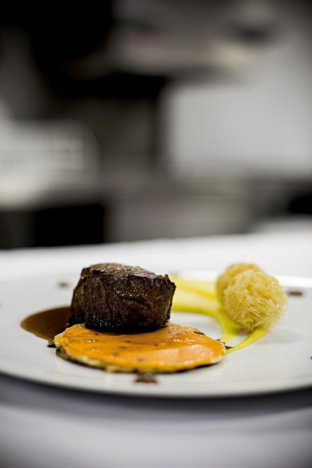 Aparentemente, a adaptação do espaço a um restaurante não parecia ser difícil. Se foi, hoje não parece. A sala originalmente envidraçada até meia altura foi entretanto coberta de cortinas, o espaço de circulação é generoso, uma ilha no centro confere-lhe a faceta de relaxamento de um bar, uma parede de vidro ao fundo desvenda-nos uma parte da garrafeira, os móveis e as coberturas seguem o rigor da decoração das casas com a marca do chef. Ao todo, cabem nesta sala 104 comensais — a que se juntam mais 60 no espaço do mezanino, que pela sua localização parece mais recomendado para festas privadas ou para as acções de formação que o Rui Paula do Recife tem vindo a organizar com sucesso.