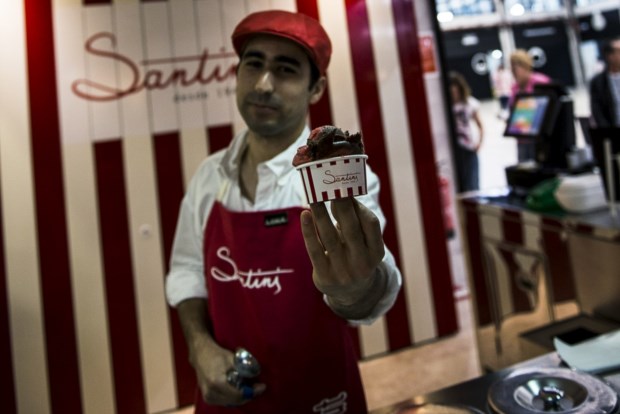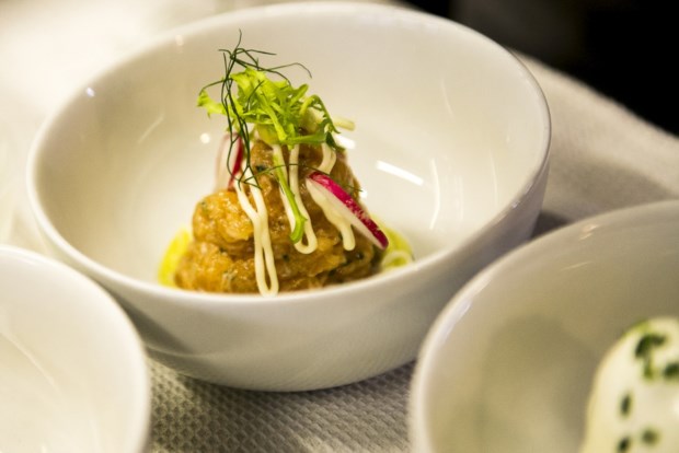 À entrada há três esplanadas – Trincas (do The Decadente), Aloma, Azul – e tudo estava organizado para que os convidados entrassem no interior pela zona dos chefs, onde se pode comer por uma média entre os 8 e os 15 euros. Alexandre Silva, Miguel Castro e Silva, Henrique Sá Pessoa, Marlene Vieira e Vítor Claro alinham-se num dos topos, lado a lado, com diferentes propostas de cozinha de autor. Alexandre Silva quer trabalhar os produtos que se vendem no próprio mercado, por onde promete passar todos os dias; Miguel Castro e Silva vai ter petiscos, entre os quais tostadas, empadas, pastéis, francesinhas, e depois pratos com base em arroz ou à Brás (na sexta circulava pela festa um à Brás de pato); Sá Pessoa vai apresentar pratos da sua autoria adaptados a um espaço como este, como uma sanduíche de leitão ou um tártaro de robalo com abacate e manga.