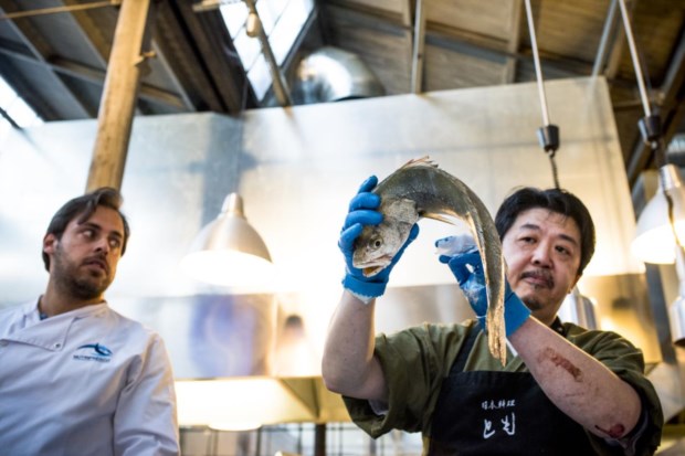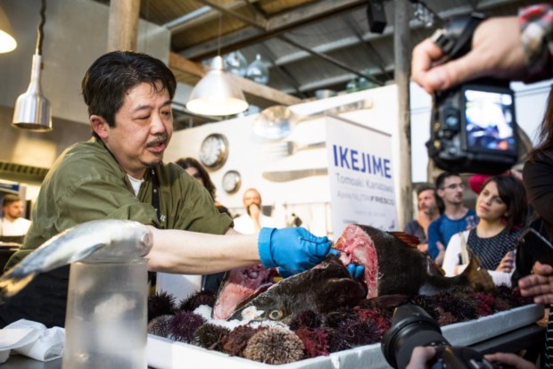 A cena passa-se na segunda-feira à noite, na 1300 Taberna, na LX Factory, em Lisboa, antes de se iniciar o primeiro dos dois jantares do Sangue na Guelra – Young Chefs with Guts, projecto satélite do festival Peixe em Lisboa. Com o apoio da empresa Nutrifresco, que comercializa peixe, e do chef japonês Tomo (do restaurante Tomo, em Lisboa) estamos ali para assistir ao ikejime, um método tradicional japonês de matar um peixe “sem stress” ou, pelo menos, com o mínimo de stress possível.