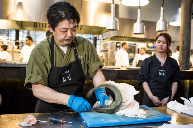 O ambiente é solene e as câmaras fotográficas estão prontas para registar o momento. Pedro Bastos, da Nutrifresco, tem junto a si, numa caixa cheia de água, um robalo, com o qual Tomo vai demonstrar a técnica. Ao lado, um cartaz mostra em diferentes tipos de peixe os respectivos pontos de ikejime, todos situados um pouco acima do olho.