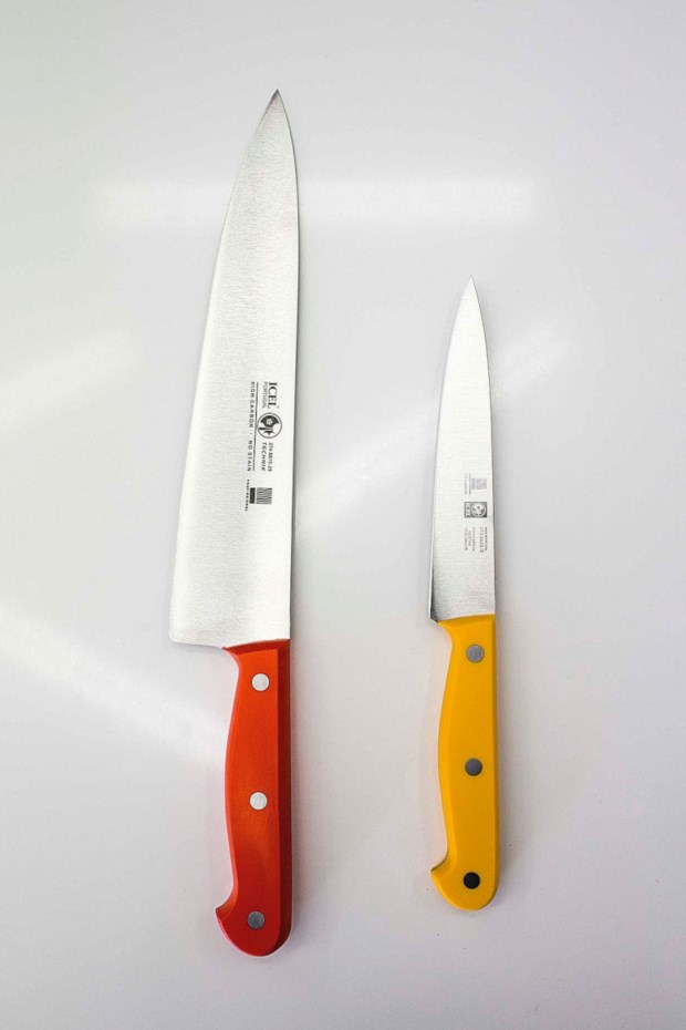 Há centenas de facas diferentes para diferentes funções. Estas são multiusos, o que significa que servem para tudo não sendo, contudo, as mais indicadas para fins muito específicos. Há uma faca japonesa (as lâminas japonesas são consideradas as melhores) chamada Santoku, que serve para três fins: cortar, filetar e fazer cubos. Aviso: as facas cortam deslizando e não por pressão. As pontas dos dedos devem estar recuadas e a lâmina deve encostar à articulação do dedo.