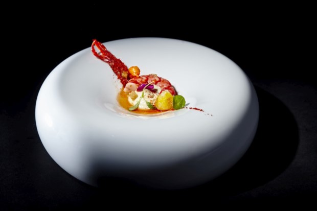 Quando era criança, Leonel Pereira vivia no Algarve interior, onde o prato mais comum, “aquele que toda a gente sabia fazer”, era a açorda. “Faz-me pensar nos meus avós, que já cá não estão, e que comiam a açorda mais simples que há, só com um ovo.” Ele apanhou uma época de maior abundância. “Já se punha um bocadinho de peixe ou camarão.” Na adaptação que aqui fez (usando carabineiro), teve “o cuidado de partir dessa simplicidade” e de “garantir que está lá tudo”. Sente que este “é um jantar de emoções, porque o que nos estão a pedir é um bocadinho de nós.”