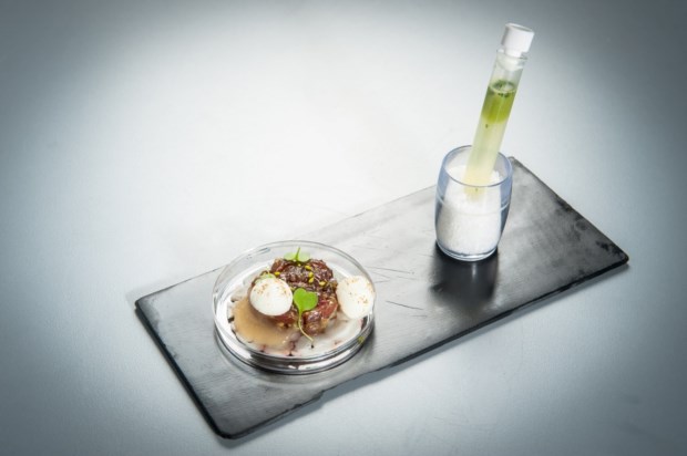 Num espaço de descoberta e experimentação que marcou gerações, Nuno e Mário casaram o local e o cosmopolita, numa sequência de pratos de mar. Ao polvo e ao bonito seguiu-se uma composição de cebola-do-mar (prima do nosso ouriço) e uma "craca" inteiramente comestível, a casca feita de uma finíssima massa de wonton, o recheio, uma espuma e o molusco, terminando a série marinha com um chowder a envolver supremos de cântaro, congro, garoupa e lula, de sabor aprofundado pelas presença de inúmeras algas. O limpa-palatos à base do sumo da aromática mandarina, foi, de novo, evocador dessa «tropicalidade transplantada».