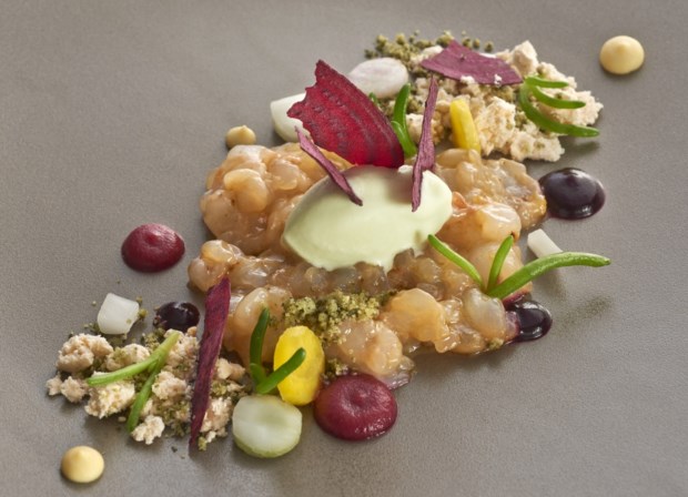 Seguiu-se peixe-galo com uma discreta tapioca, azeite e limão, funcho e alcaparras; raia com enguia fumada, couve-flor e wasabi, mais uma mistura que podia ser arriscada mas que é inteligentemente conseguida; um tártaro da magnífica gamba da costa com diferentes texturas de beterraba. Depois chegaram os sabores da terra, com cêpes parmesão e fava tonka; pombo com couve-flor, baunilha e pinhões; e por fim novilho com topinambo, endívias e cebola assada.