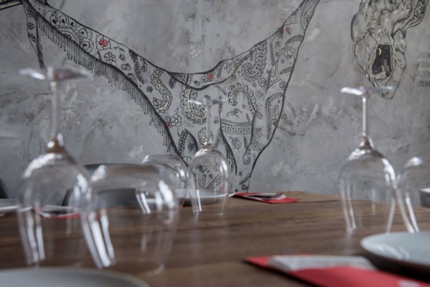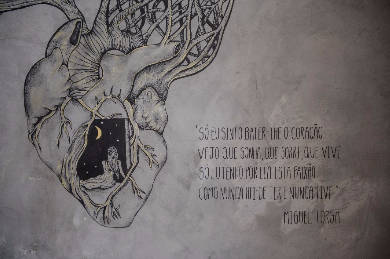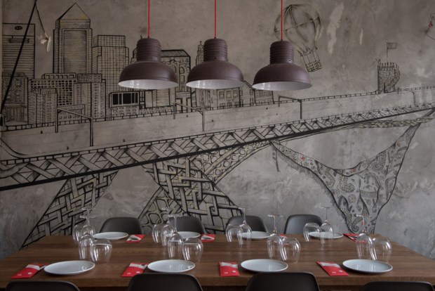 É ela que olha a noite estrelada dentro de um pormenorizado coração desenhado na Wall Artwork, na sala do primeiro andar, uma enorme ilustração feita por “dois estudantes do 12.º ano de Belas Artes”. Em volta, uma viagem pela cultura portuguesa: da rapariga francesa que terá inspirado o nome da iguaria portuense ao brinco de filigrana de Viana, do lenço que as fadistas usam sobre os ombros aos balões de São João, da época dos Descobrimentos à saudade, das fachadas da Ribeira à ponte Luís I, que ali une igualmente as heranças portuguesas à esperança no futuro que carrega o novo projecto em Londres (com desenhos do turístico London Eye e outros edifícios da cidade).