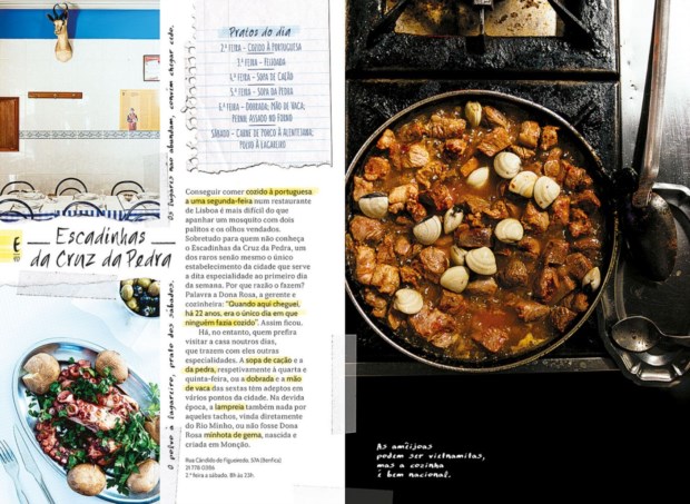Por isso, para homenagear esta instituição do prato do dia da tasca, o livro inclui no final uma lista dos locais e dos dias em que se pode comer bacalhau assado, cozido à portuguesa e feijoada. E, para terminar, um conselho dos autores: se não puder ir às 50 tascas, vá às sete com Palito d’Ouro. Aí vai encontrar “comida tradicional de grande qualidade, serviço eficaz, castiço, generoso até, e preços que não só não ofendem como chegam a comover.”