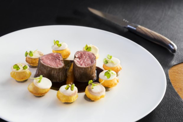 O prato de carne é compostouns excelentes lombinhos de vaca Rubia Gallega (raça da Galiza) envelhecida, com manteiga de pimenta da Jamaica, que foi acompanhado por um excepcional vinho Vega Sicília Único 2007, da Ribera del Duero. A refeição terminou com uma sobremesa de bergamota, morango e hibiscos e com mais uma viagem por Espanha – fazendo espelho com a do início – mas desta vez através de doces.
