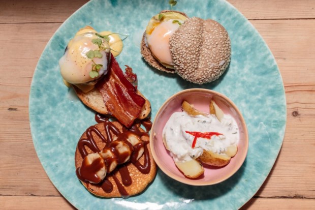 Optamos por experimentar o primeiro e o terceiro. O Ressaca talvez seja o mais seguro e até tradicional, tem pão, ovos e bacon. Mais concretamente: Bruschetta de pão de Mafra com bacon, um ovo misteriosamente deitado num cogumelo Portobello e molho Hollandaise; no mesmo prato tem ainda um pãozinho de sementes com abacate, ovo cozido a baixa temperatura e molho Chimichurri; numa taça vem uma salada fria de batata com tomilho; e termina com uma panqueca com creme de avelã e banana.