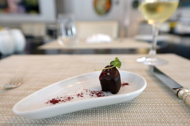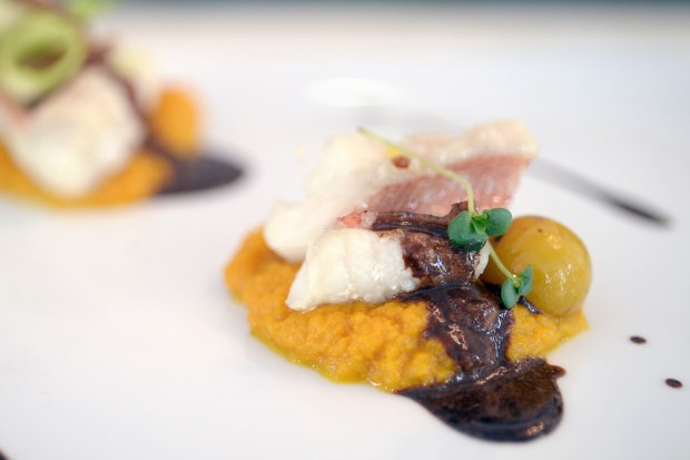 Já na sala principal do Astória – que estará vestida a preceito para a ocasião, com decoração a cargo de Paula Franzini, em colaboração com a Me Allegro – começará depois o verdadeiro desfile das criações do chef Pedro Sequeira, que já tivemos a oportunidade de experimentar num almoço de apresentação. O amouse é constituído por um bombom de chocolate 70% com foie gras e pó de framboesa. Acompanha com Quinta da Pedra 2011, um 100% Alvarinho fresco e frutado. Miguel Pinho, director comercial da IdealDrinks, explica que “a acidez que o caracteriza vai contrastar com o amargor” do cacau. Não somos especialistas, mas, depois desta lição, conseguimos perceber que este pairing resulta bem.