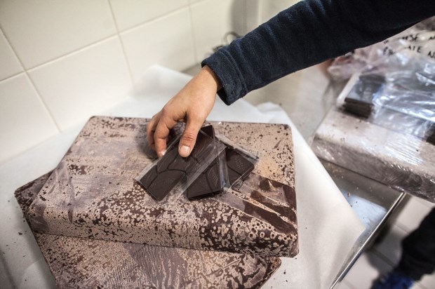 Não foi por acaso que o usaram com o cacau da Tanzânia, que tem características muito especiais, com um grande nível de acidez. Susana fala em “alquimia” quando se trabalha estes grãos. “Ao longo das trinta horas em que fazemos a moagem em mó de pedra, o sabor muda totalmente”, descreve. “Este toque de caramelo não existe no início, mas a fricção provoca calor que faz subir a temperatura da pasta que está a ser moída. Isso ajuda a libertar os ácidos voláteis, e, quando se junta o açúcar, dá-se esta caramelização, o que não acontece, por exemplo, com o da Nicarágua porque não é tão ácido.”